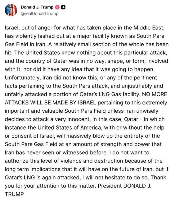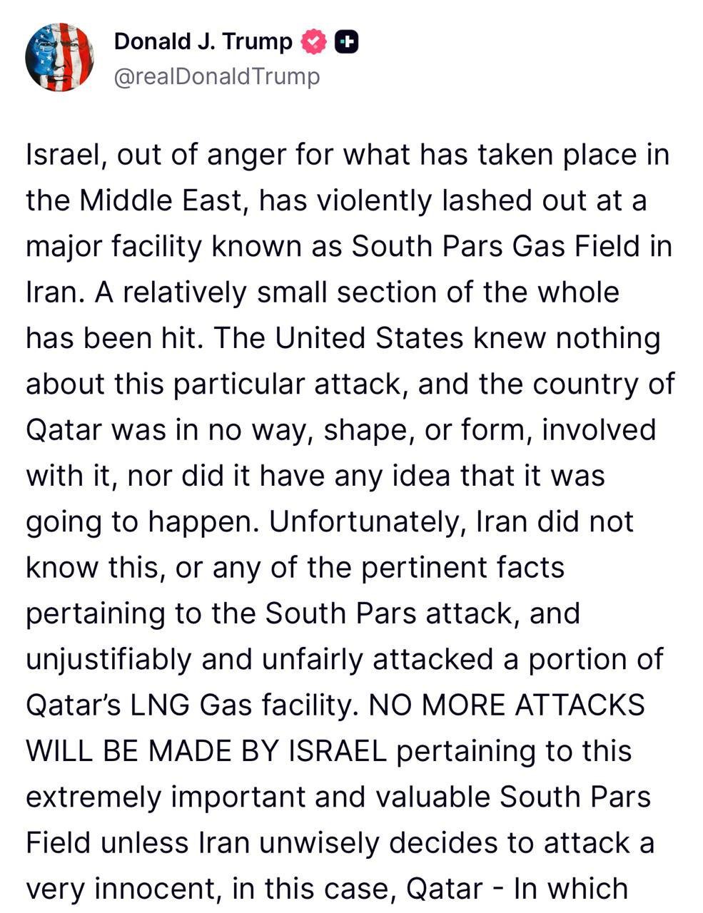 "Netanyahu did not tell me that he was going to 'strike hard'" - Donald on Truth Social accused of destroying the world's largest gas field in tonight."Israel is angry about what is happening in the Middle East