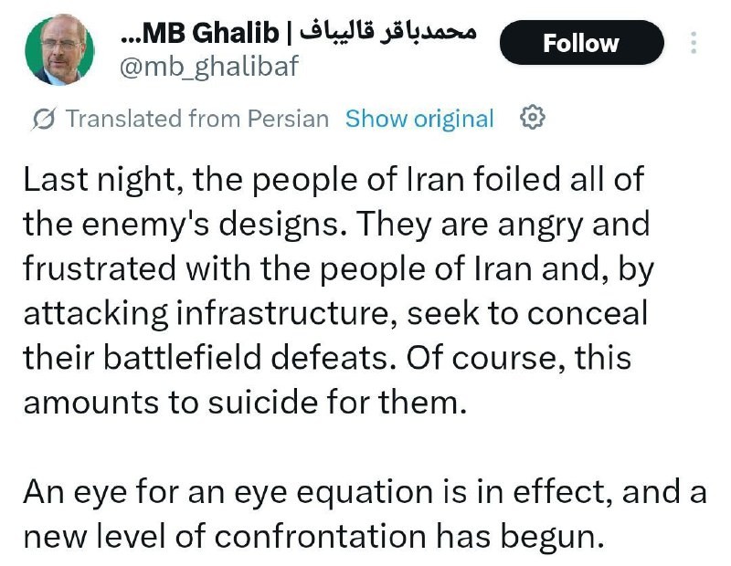 'NEW LEVEL of confrontation' after US/Israeli 'SUICIDAL' infrastructure attacks — Parliament Speaker Ghalibaf