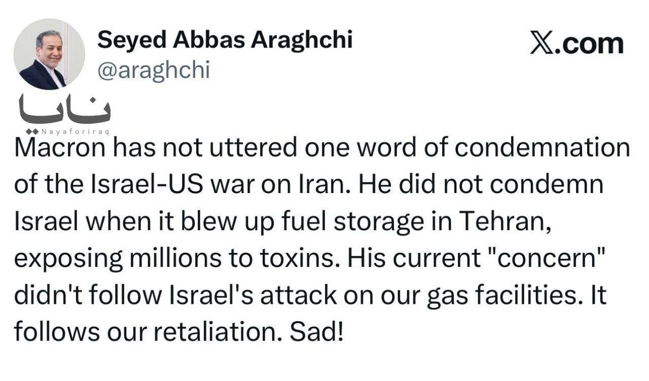 Iranian Foreign Minister:Macron hasn't said a single word condemning the Israeli-American war against Iran.He did not condemn #Israel when it blew up fuel storage facilities in Tehran, exposing millions of people to toxic substances.