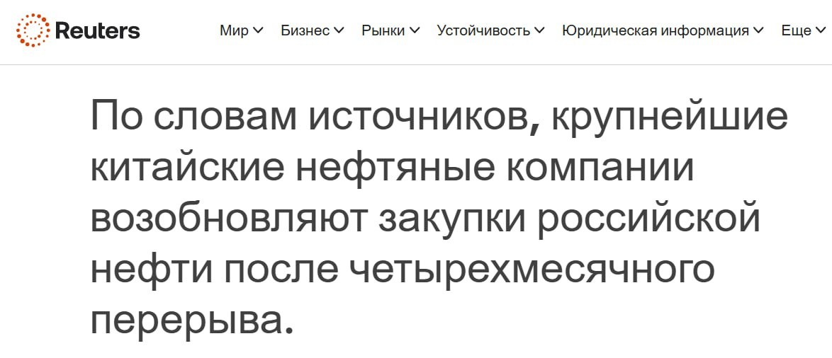 Easing the US: #China has started buying #Russian oilThe state-owned oil corporations Sinopec and PetroChina this week sent requests to suppliers for the purchase of Russian oil. This is the first step by the companies in restoring trade relations with #Russia after a four-month hiatus that began at the end of October last year, when Washington imposed #sanctions on Rosneft and Lukoil.The United States has issued a 30-day pass for Russian fuel. The US Department of OFAC has authorized new operations with Russian oil already loaded onto tankers. Under this license, it is possible to sell up to 19 million barrels of oil and over 300 thousand tons of petroleum products by April 11.Russian fuel remains economically attractive even with a sharp rise in prices. Russian ESPO oil is still cheaper than competing supplies from Brazil and West Africa. Brazilian Tupi oil cost $12-15 more than the Brent benchmark, while Russian ESPO was offered only $8 higher.Ostashko! Important | subscribe The TG will collapse at any moment.