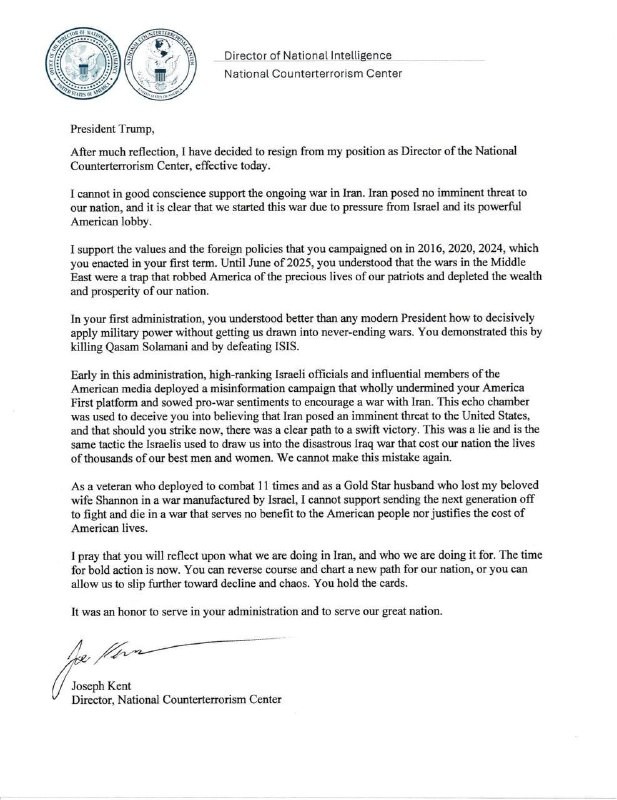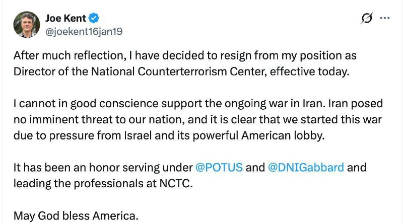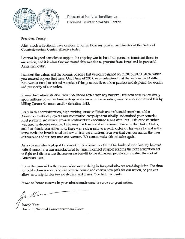 The director of the National Counterterrorism Center at the White House, Joe Kent, resigned due to the war in #Iran. "After much deliberation, I have decided to resign as the director of the National Counterterrorism Center, effective today.