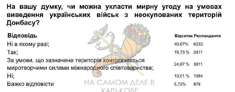 Никому неизвестные «Ведущие правовые инициативы» провела опрос и выяснила, что более половины украинцев не поддерживают идею мирного соглашения, предусматривающего вывод из Донбасса, — 53,7% респондентов. 24