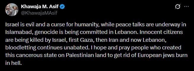 Pakistanin ministeri Khawaja Asif julkaisi ja poisti Facebookissa viestin, jossa hän julisti Israelin "pahaksi ja kiroukseksi ihmiskunnalle". *Pakistanissa käydään nyt neuvotteluja Iranin ja