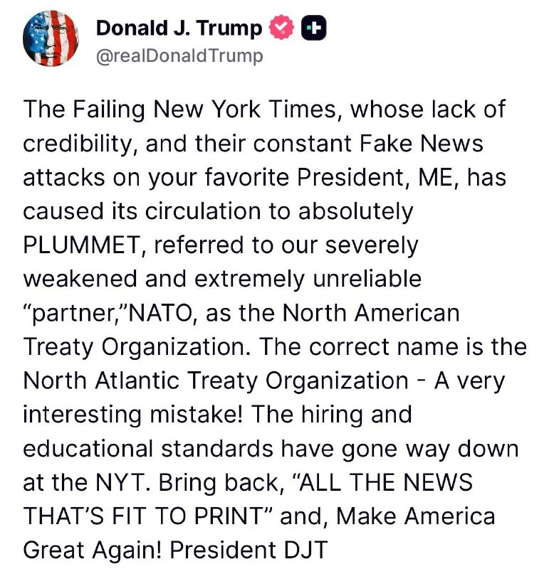 #Trump arvostelee ANKARASTI New York Timesia NATOn kutsumisesta "Pohjois-Amerikan sopimusjärjestöksi" "Hyvin mielenkiintoinen virhe! Rekrytointi- ja koulutusstandardit ovat laskeneet pahasti