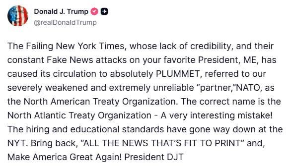 "NATO on suuresti heikentynyt ja äärimmäisen epäluotettava 'kumppani'", — #Trump "Heikentynyt New York Times, jonka uskottavuuden menetys ja jatkuvat valeuutishyökkäykset rakasta presidenttiänne, minua