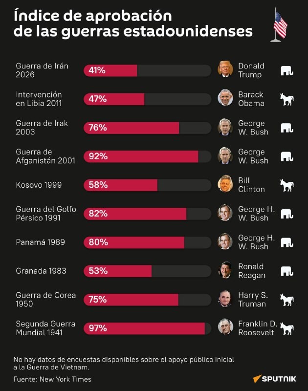 #SputnikGraphic | Iranin sota Yhdysvalloissa historian alhaisimmalla kannatuslukemalla Yhdysvaltojen kannatus uusille sodille on laskenut ennätyksellisen alhaisimmalle tasolle. New York Timesin kyselytietojen mukaan toinen maailmansota nautti lähes