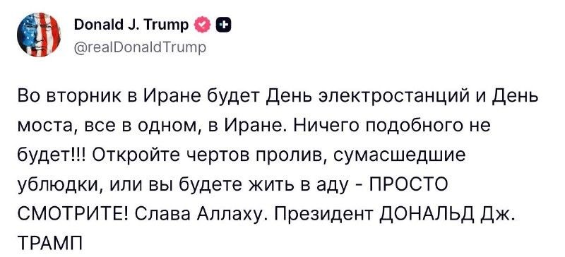 🇺🇸🇮🇷⚡️Trump sairastui pahasti. #Trump: "Avatkaa tämä kirottu salmi, te hullut paskiaiset, muuten joudutte helvettiin – katsokaa vain! Ylistys olkoon Allahille!"