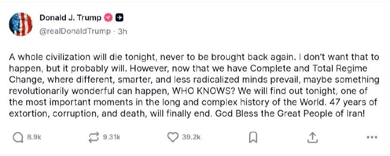 JUURI NYT: 🇺🇸🇮🇷 Presidentti sanoo, että hänen Iranille asettamansa sopimuksen solmimisen määräaika klo 20.00 ET "toteutuu". "Jos pääsemme siihen pisteeseen, tulee olemaan ennennäkemätön hyökkäys."