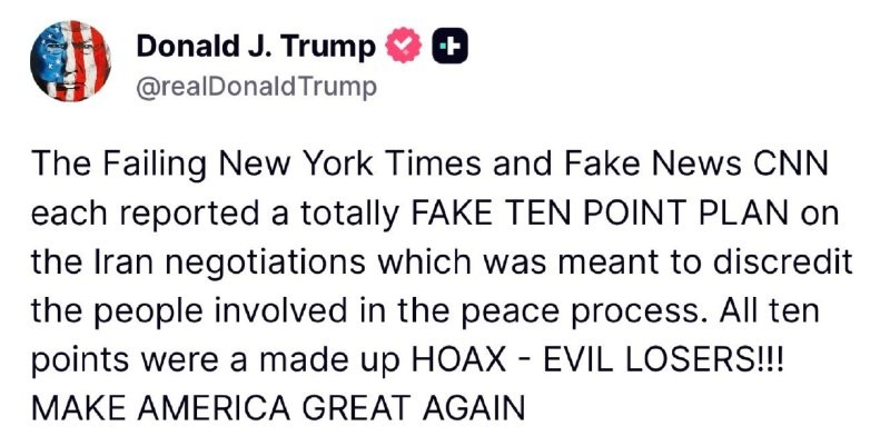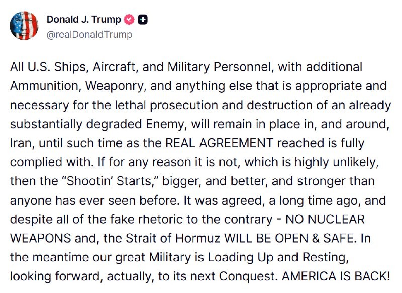 JUURI NYT - #Trump vaatii Irania noudattamaan "oikeaa" tulitaukosopimusta tai "ammuskelu" alkaa, ja lisää, että Yhdysvaltain armeija "lataa ja lepää, odottaen itse asiassa seuraavaa valloitustaan". Lähde: