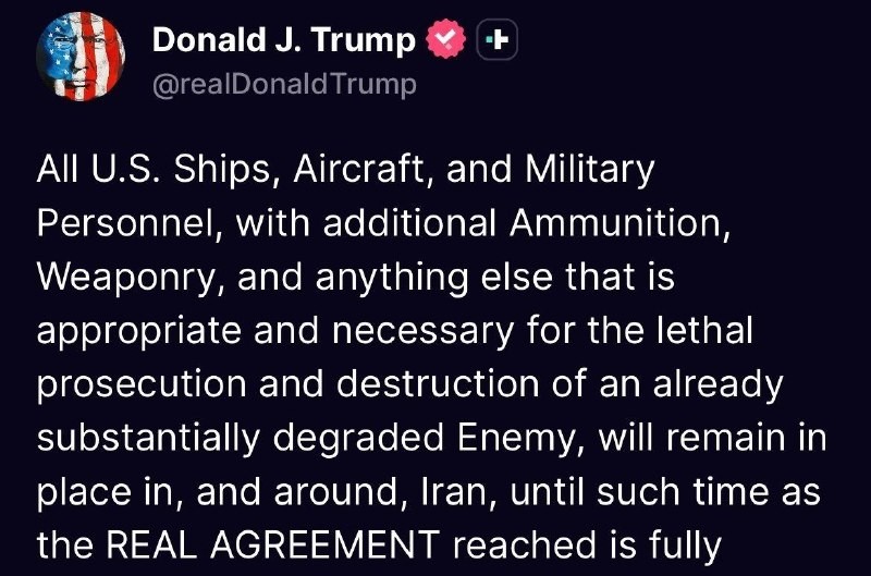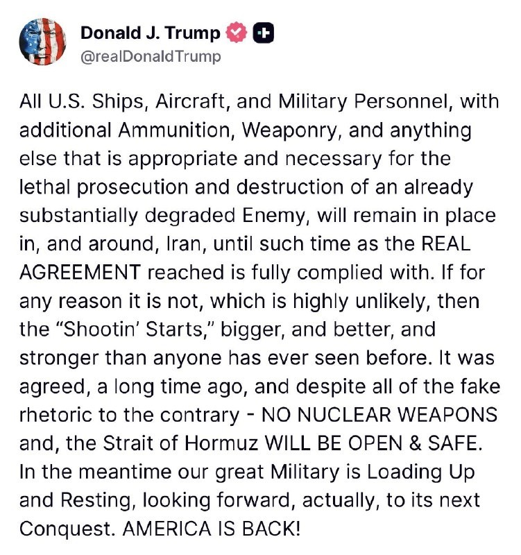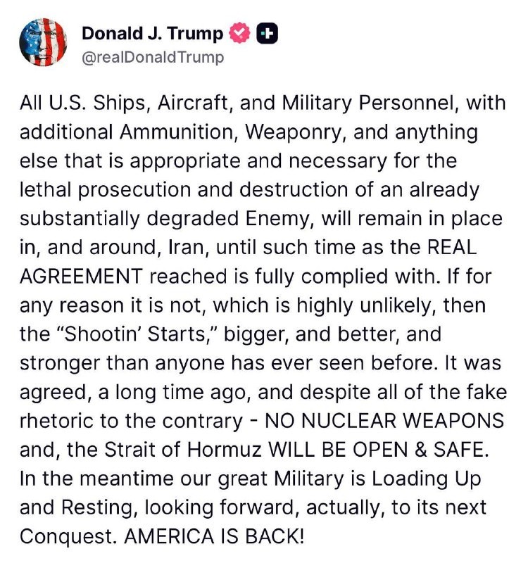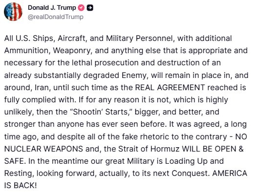 #Trump uhkaa Irania: "Kaikki Yhdysvaltain sotilaskalusto ja henkilöstö pysyvät Iranissa ja sen ympäristössä, kunnes sopimukseen päästään." Muuten "ampuminen alkaa... suurempana