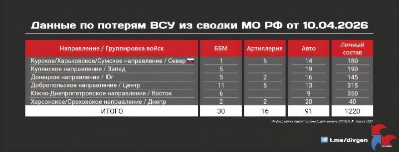 The Ministry of Defense publishes a new summary of the losses of the Armed Forces of #Ukraine The enemy's losses for today amounted to: -1220 military personnel; -30 armored vehicles; -16 artillery systems; -91 units of special vehicles