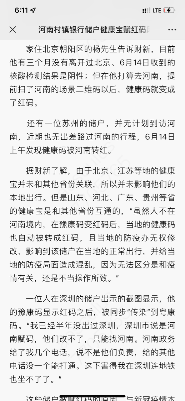 今年年初河南曾经出台过一个政策,任何从外省进入河南的人健康码马上变黄。这个政策的实质是河南公开不承认其他省份的检测结果。这次强行给全国许昌村镇银行储户发红码,又坑了承认外省健康码互认的省份的人,一个深圳居民通过度小满在河南银行存上两毛钱,就可以导致他在深圳无法进入任何公共场所。前者和抢先推出全民核酸常态化一样是为了谄媚讨好“应X尽X”的狗熊,后者是为了维稳压事随意拿起手边最近工具,共同特点是办得都特别愚蠢。上一任省长尹弘在位区区一年半,在微博上买热搜直接吹捧自己本人就买了不下五回,甚至在主导搞出河南最大生产型国企“蠢猪式违约”导致河南企业在金融系统信用破产之后,离任之际仍然买热搜给自己送万民伞;现任书记楼阳生虽然上任以来出了721,且外界期望中的利用山西经验解决河南违约问题也毫无踪迹,但在红码事件之前,暂时还看不出有何处比尹弘更加邪恶愚蠢,在红码事件之前。河南本地官僚当然也非常不行,但有句讲句河南这两年被习近平的这两个亲信坑得不轻。
