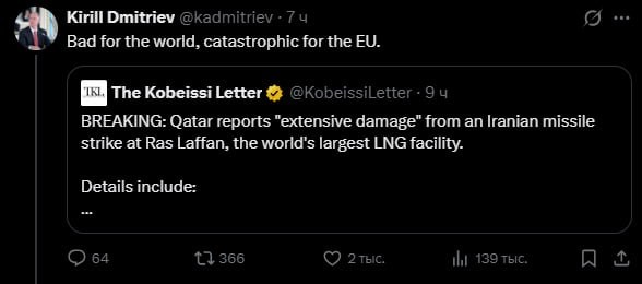 The strike on the Qatar LNG plant is a disaster for the #EU, says Dmitriev He commented on a post by the American publication The Kobeissi Letter about rising natural gas prices after the strike. "Bad news for the world, catastrophic for the EU,