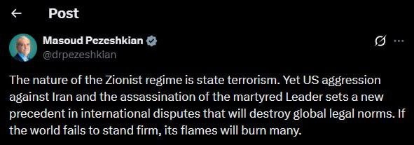 Iranian President Masoud Peseshkan said in an interview that the nature of the Zionist regime is state terrorism.:The nature of the Zionist regime is State terrorism. Nevertheless, the US aggression against and the murder of the martyred