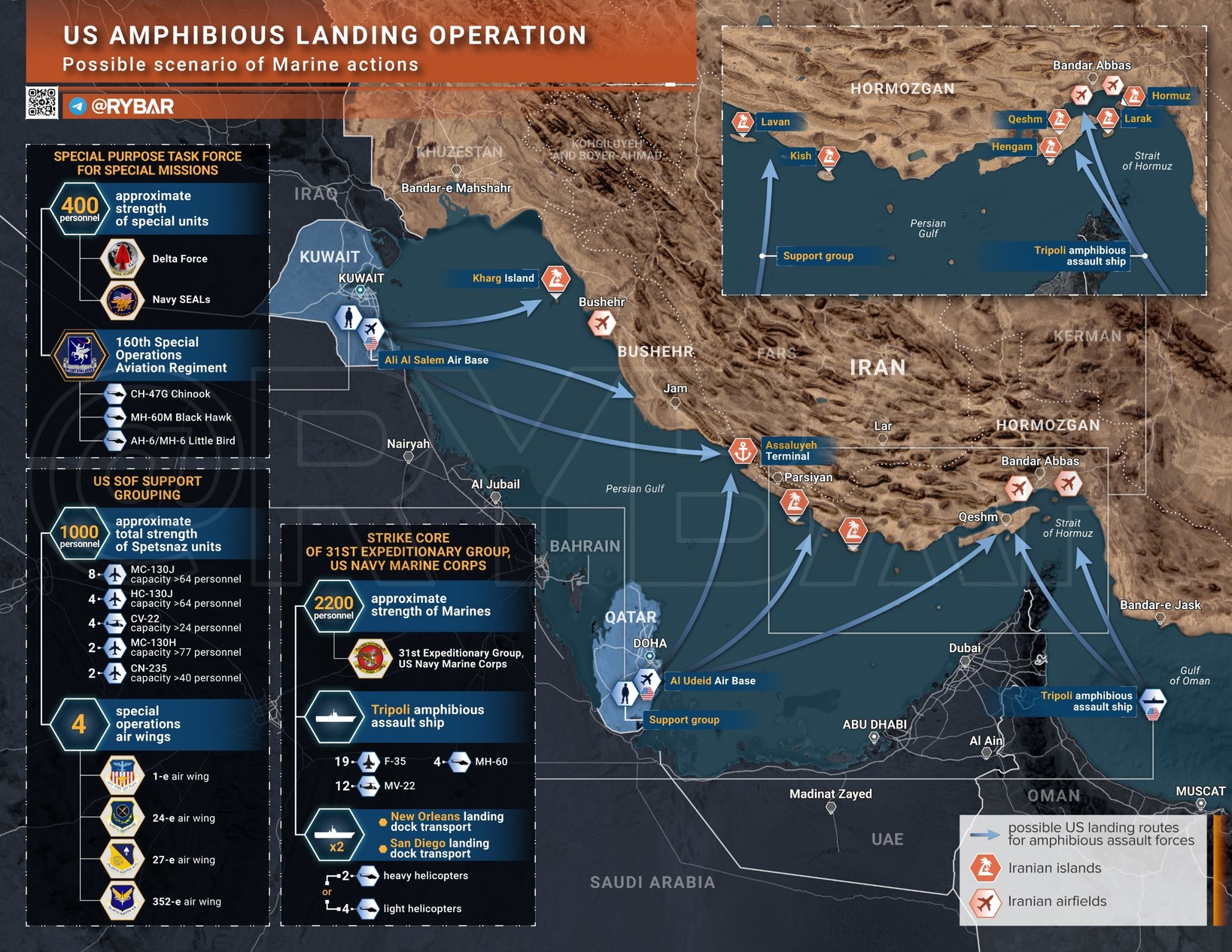 Possible scenarios for the actions of the US Armed Forces to land troops on the territory of #Iran, seize and export stocks of enriched uranium, as well as the forces and means involved.@poisk_mil
