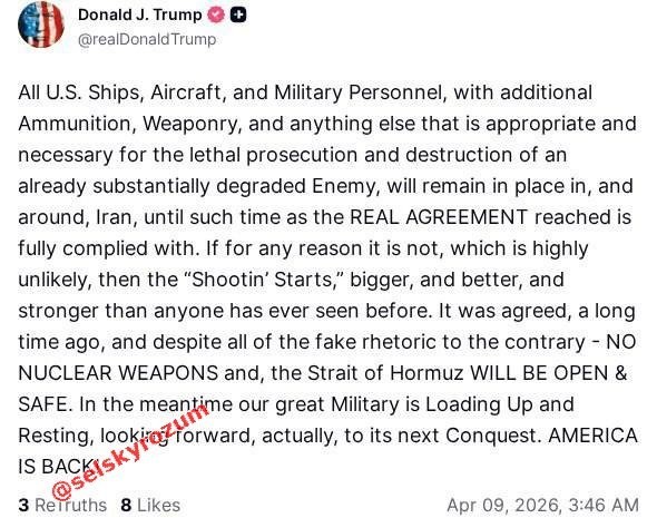 Všechny lodě, letouny a vojáci zůstanou na svých místech „na území Íránu a v jeho blízkosti“, dokud nebude splněna dohoda, oznámil . „Pokud se tak z jakéhokoli důvodu nestane, což je velmi nepravděpodobné, pak začne střelba, rozsáhlejší