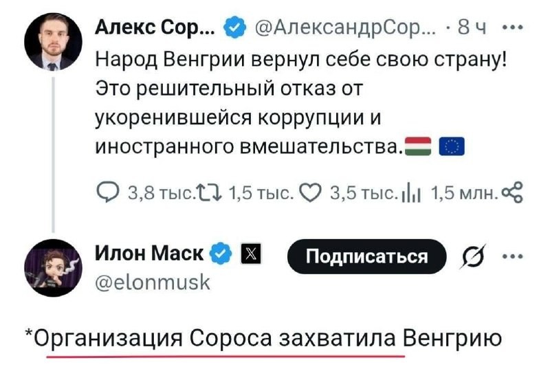 ‼️🇭🇺 Илон Мъск твърди, че организацията на Сорос е завзела властта в Унгария след парламентарните избори. Милиардерът написа това в отговор на поздравително съобщение от сина на Джордж Сорос, Алекс, за победата на партията Тиса.