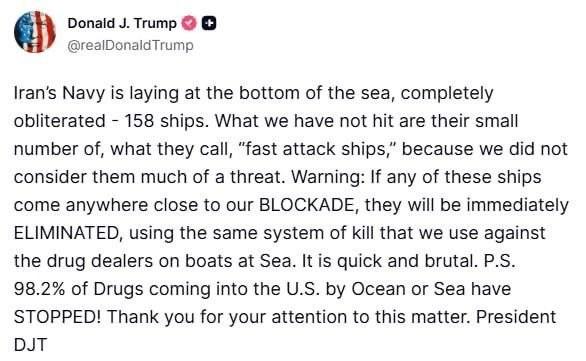 Тръмп заплашва да унищожи ирански кораби, които се приближават до американския флот, блокиращ Ормузкия проток „Не сме насочили атаките към техните малко на брой така наречени „бързи атакуващи кораби“, защото не ги смятахме за сериозна заплаха.