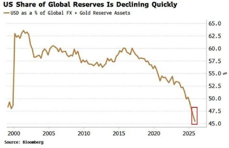 Делът на щатския долар в световните резерви е спаднал до 26-годишно дъно. В момента доларът представлява около 46% от световните резерви – най-ниското ниво през 21-ви век. По-ниско ниво е било едва в началото на 90-те години на миналия век
