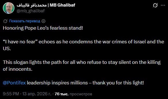 Председателят на иранския парламент подкрепи папата в спора му с Тръмп. „В чест на безстрашната позиция на папа Лъв! „Не се страхувам“ – тези думи се чуват, когато той осъжда военните престъпления на Израел и Съединените щати.