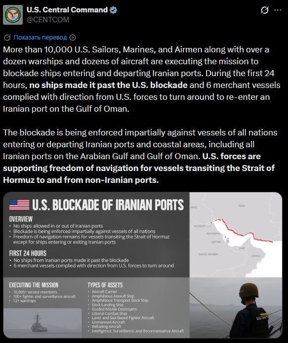 Според Централното командване на САЩ, нито един кораб не е преминал блокадата за 24 часа. „Повече от 10 000 американски моряци, морски пехотинци и военновъздушни сили, заедно с повече от дузина военни кораби и десетки самолети