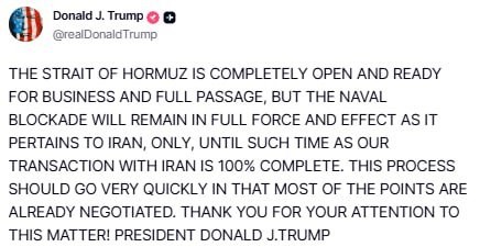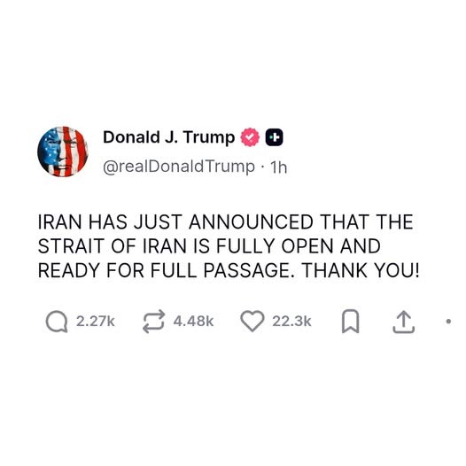 😳😁След като похарчи 54 милиарда долара за войната и загуби хора и машини, Америка най-накрая успя да отвори Ормузкия проток, който вече беше отворен преди началото на войната. А сега той се нарича Ирански проток. Голяма победа за Тръмп.