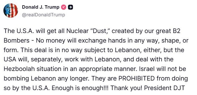 Тръмп: САЩ забраниха на Израел да бомбардира Ливан и ще получат целия „ядрен прах“ от Иран. „САЩ ще си сътрудничат отделно с Ливан и ще разрешат правилно ситуацията с Хизбула. Израел вече няма да бомбардира Ливан. САЩ го ЗАБРАНЯВАТ. Стига!