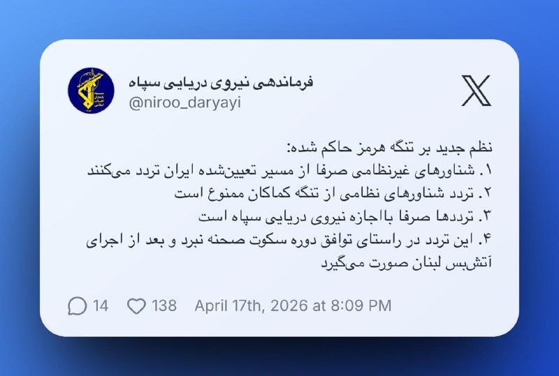 Командването на Корпуса на стражите на ислямската революция официално обяви нови навигационни правила в Ормузки проток. Според изявлението, контролът над региона е навлязъл във фазата на „нов ред“
