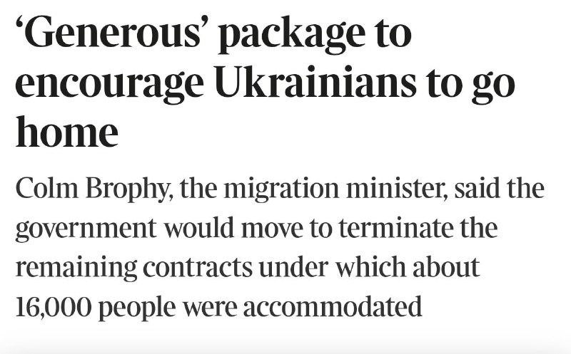 Ирландия възнамерява да депортира 16 000 украинци, — Sunday Times Министърът на миграцията обяви, че договорите за настаняване на приблизително 16 000 украинци ще бъдат прекратени в рамките на една година и ще бъде стартирана политика за връщането