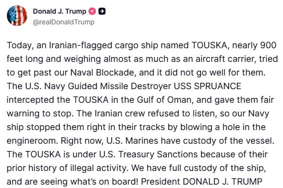 Тръмп: САЩ удариха и завзеха ирански кораб в Оманския залив Президентът на САЩ казва, че корабът се е опитвал да пробие американската блокада. „Днес иранският товарен кораб TOUSKA, дълъг близо 900 фута и тежък почти колкото самолетоносач