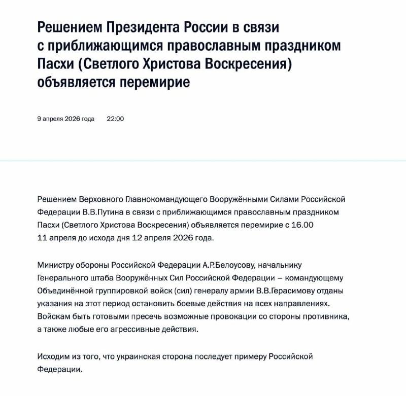 ‼️🇷🇺🇺🇦 Владимир #Путин обяви Великденско примирие Великденското примирие е обявено от 16:00 часа на 11 април до края на деня на 12 април 2026 г.