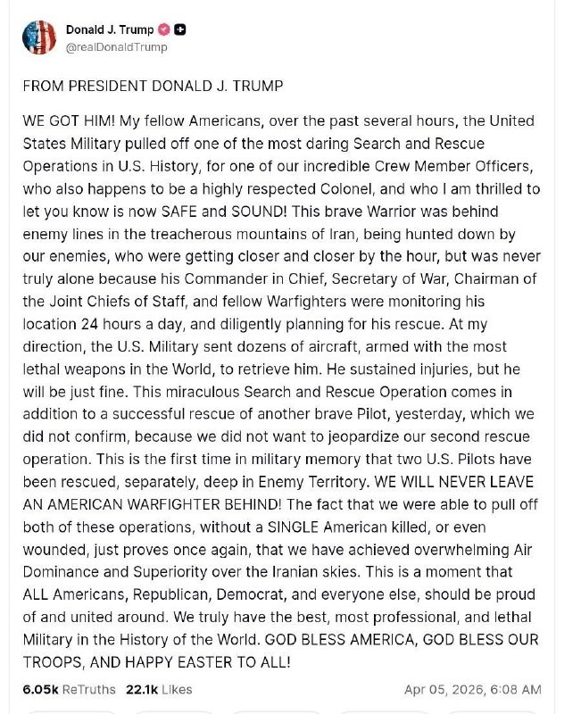 Тръмп обяви спасяването на втория пилот на сваления в Иран изтребител. Според него американските военни са провели „една от най-дръзките операции по търсене и спасяване в историята на САЩ“. Той съобщи за евакуацията на офицер
