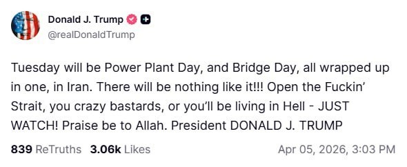 Доналд Тръмп в социалните си мрежи: Във вторник Иран ще отбележи едновременно „Ден на електроцентралата“ и „Ден на моста“. Никога не сте виждали нещо подобно!!! Отворете протока, луди копелета, или ще живеете в ада – ГЛЕДАЙТЕ САМИ! Слава на Аллах.