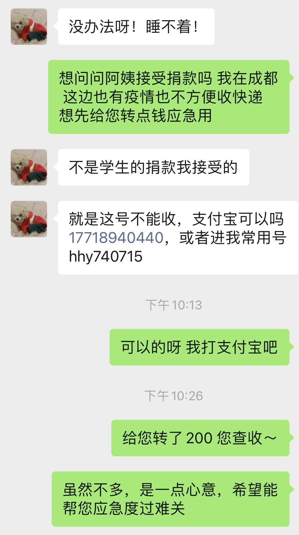 @aotuskyer 我问啦!阿姨说不是学生的捐款她可以接受的!原话在这里:“就是这号不能收,支付宝可以吗17718940440,或者进我常用号hhy740715”(我刚转了两百)