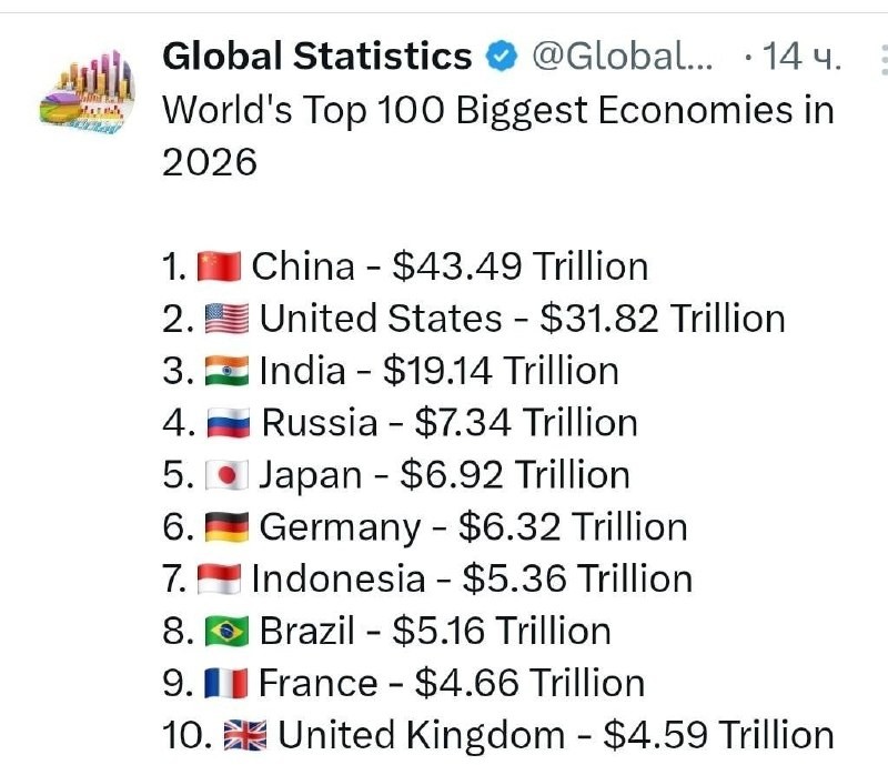 Публикуван е списък на 10-те водещи икономики в света през 2026 г. Русия е на четвърто място, оставяйки зад себе си Франция, Германия и Япония. https://t.me/aviapro1/94090Публикуван е списък на 10-те водещи икономики в света през 2026 г.