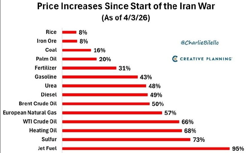 Средно увеличение на цените на ключови стоки и суровини от началото на операцията на коалицията Епщайн срещу Иран: — Авиационно гориво +95% — Сяра +73% — Мазут +68% — Суров петрол WTI +66% — Природен газ за #Европа +57% — Суров петрол Brent +50% —