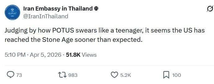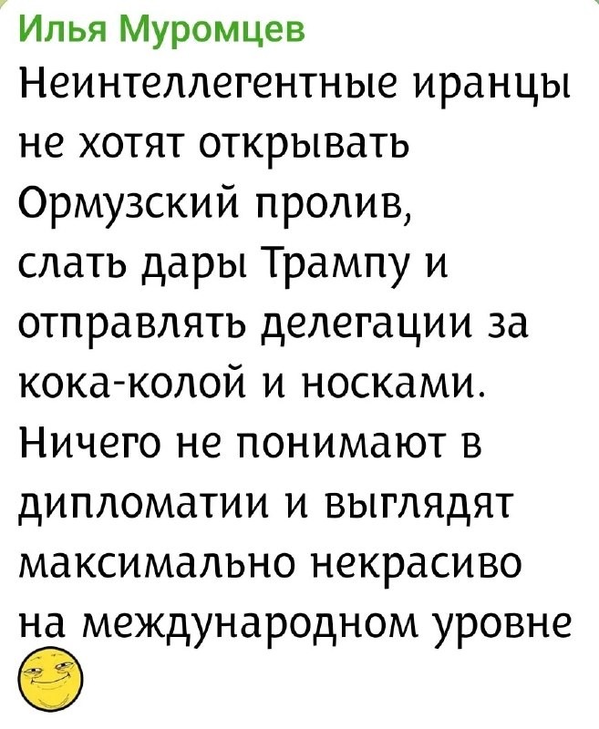 Посолството на Иран в България: Тръмп в момента На снимката рижият клоун Тръмп, заседнал в Ормузкия проток, заявява: Не мога да дишам https://t.me/voiceofiran_ru/17034 Aбонирайте се за: 📱 InfoDefenseBULGARIA 📱 InfoDefense