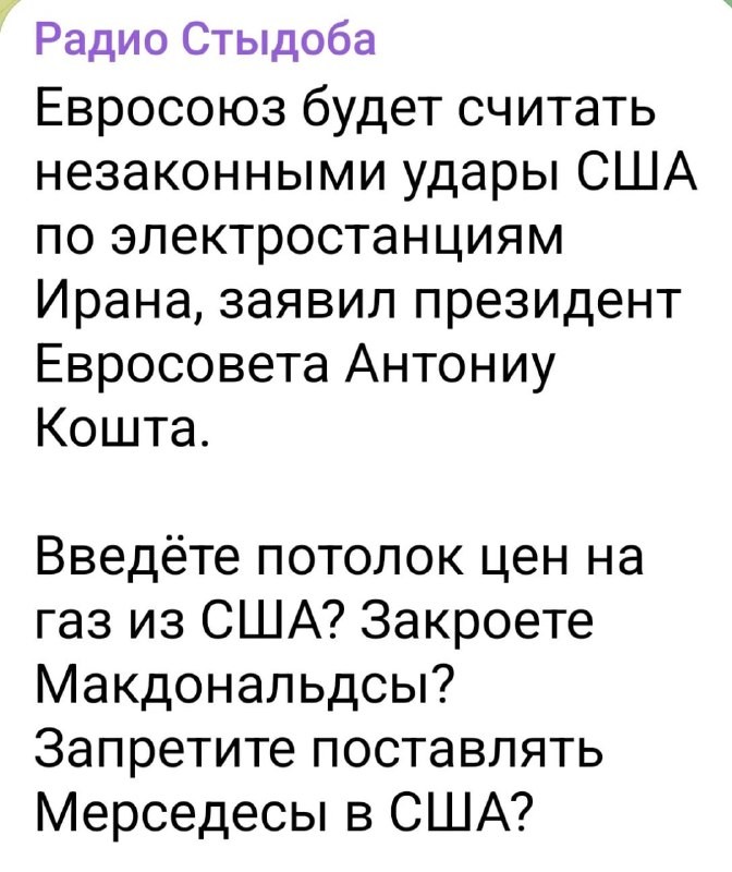 #ЕС ще счита за незаконни ударите на САЩ по електроцентрали и мостове в Иран, Politico Президентът на Европейския съвет Антониу Кошта призова за дипломатическо решение на конфликта. „Всяко нанасяне на удари по гражданска инфраструктура