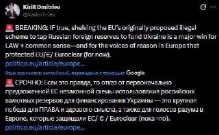 The EU's refusal to steal #Russian assets is a major victory for law and common sense, - special representative of the Russian President Kirill Dmitriev "If this is true, then the rejection of the EU's initially proposed illegal scheme of using Russian