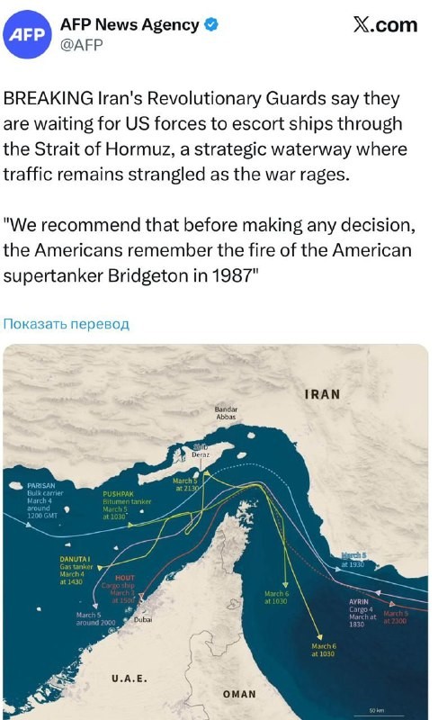 AFP: Iranin armeija odottaa Yhdysvaltain joukkojen saattavan aluksia Hormuzinsalmen läpi.