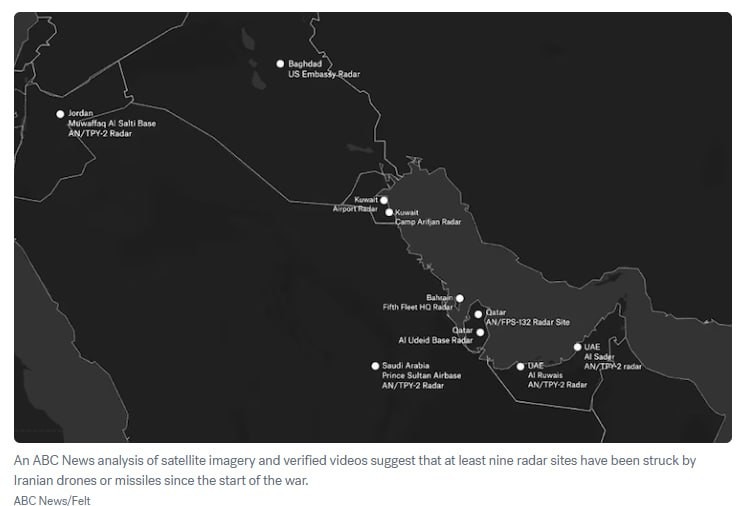 #Iran has attacked at least 10 radar sites in the Middle East since the war began, according to ABC News The publication reached this conclusion after analyzing satellite images and video. Some of the attacked systems