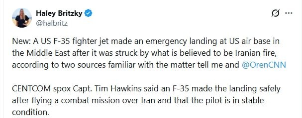 American media reported that the Iranian air defense was able to hit one of the American F-35 fighter jets, but it was able to reach the airfield.https://t.me/ImpNavigator/13451