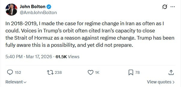 🇺🇸🇮🇷⚡️- John Bolton laments that he made the case for regime change in #Iran as often as possible in Trump's first term however was shut down over concerns about the Strait of Hormuz.