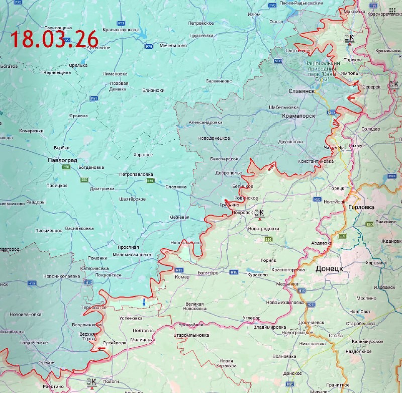 18.03.26 Сводка. Боевые действия с 14 по 18 марта 2026 года. В районе Северска ВС РФ предприняли ряд атак пехотными и механизированными подразделениями около Закотного и в направлении Рай-Александровки.