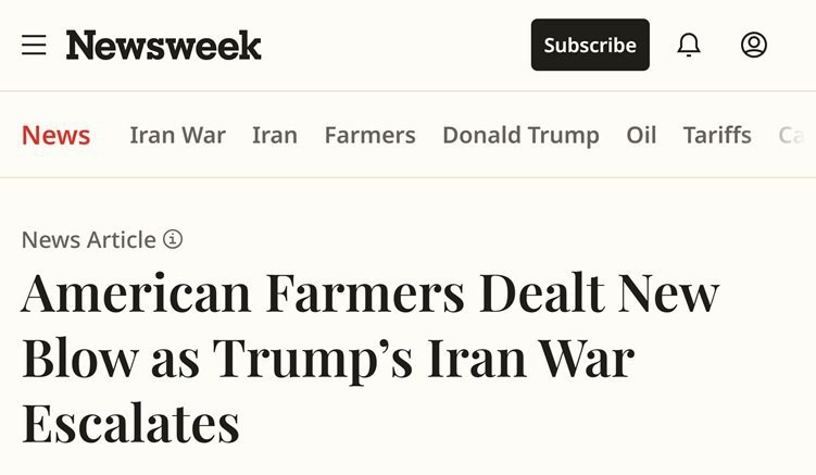 War with is another blow by against American farmers, Newsweek reports 44%, up to $683 per ton, a surge in urea prices in the United States. Fertilizers have risen sharply in price because of the blocking of the Strait of Hormuz and...