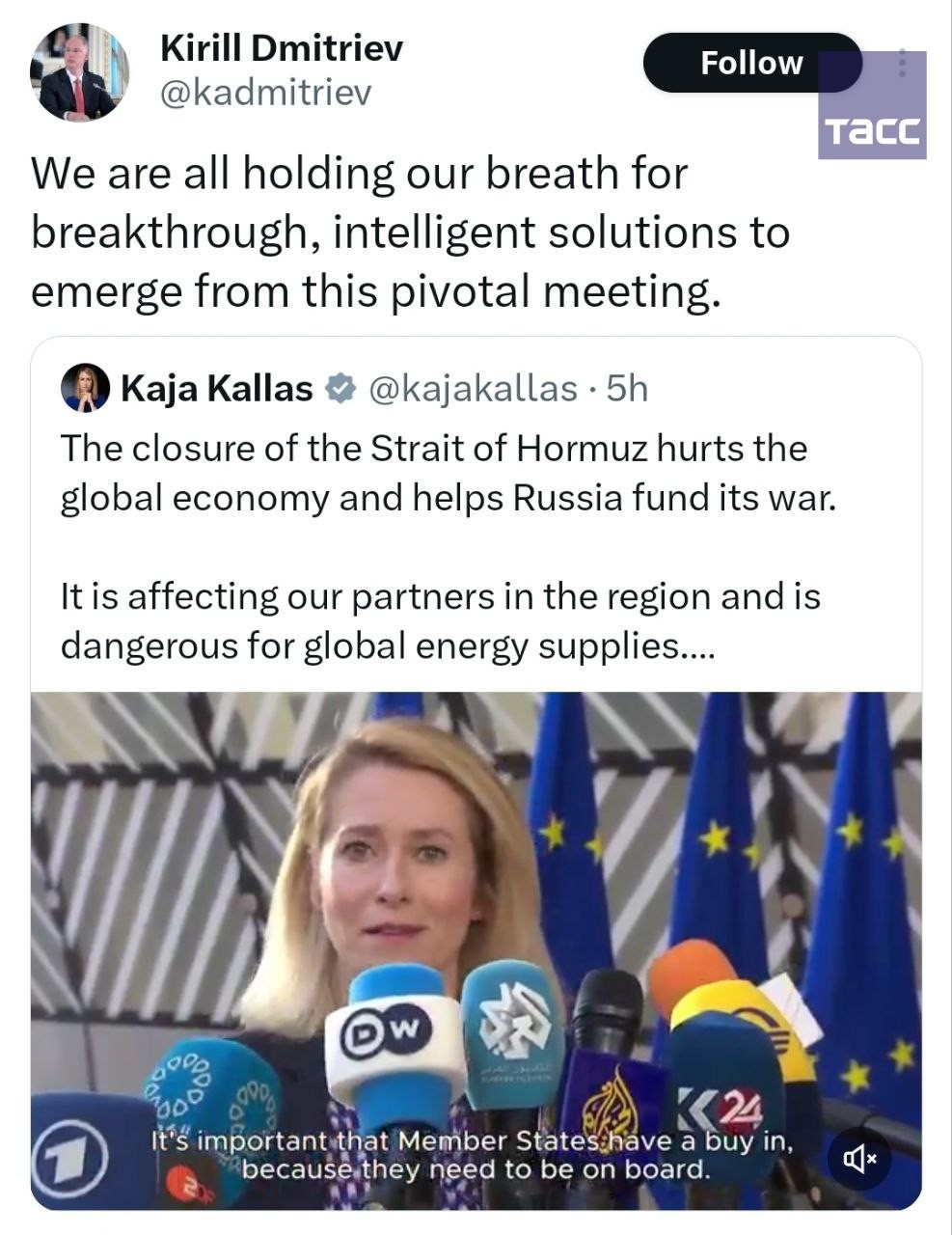 Dmitriev commented on ' words about the discussion by the foreign ministers about sending their warships to the Strait of Hormuz.:"We are all waiting with bated breath for breakthrough, reasonable solutions to appear at this crucial me...
