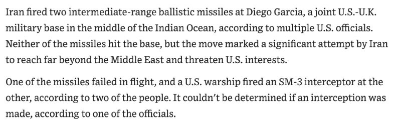 JUURI NYT: 🇮🇷 #Iran ampui ballistisia ohjuksia Yhdysvaltojen ja Ison-Britannian sotilastukikohtaan Intian valtamerellä, WSJ raportoi.