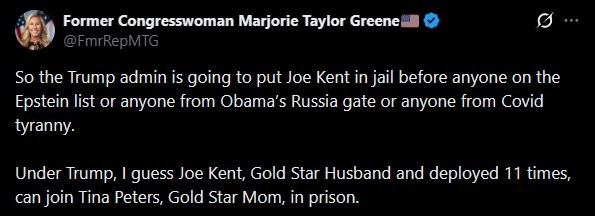 Former congresswoman Marjorie Taylor Greene slams FBI over Joe Kent controversy: " admin sending Joe Kent to jail first." "Before anyone on the list, Obama's gate, or Covid tyranny." Priorities, man.