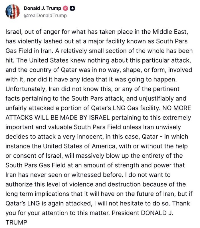JUST IN: 🇺🇸🇮🇷 President says US "knew nothing about" Israeli attack on Iran's South Pars Gas Field. "No more attacks will be made by pertaining to this."