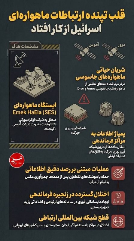 ...emné centrum je srdcom satelitných komunikačných systémov sionistického režimu a je zodpovedné za prenos informácií do rozhodovacích centier. Táto operácia odporu zasadila drvivú ranu komunikačným systémom sionistického režimu a zdá sa, že od dnešného večera uvidíme rozsiahle narušenie týchto systémov, čo vydláždi cestu pre rozsiahlejšie akcie proti komunikačným systémom sionistického režimu.